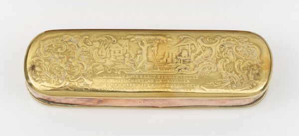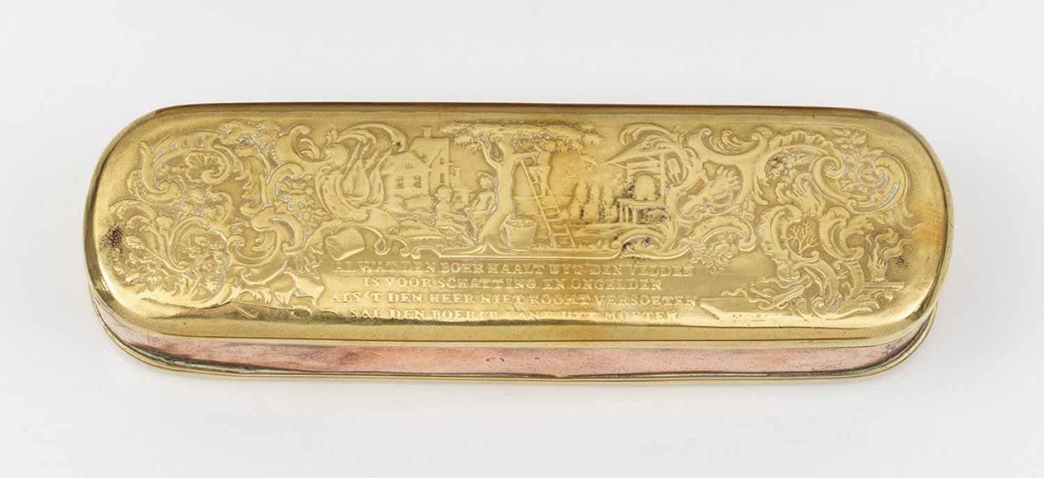 Messing und Kupfer, geprägter Reliefdekor. Auf dem Deckel Erntedarstellung sowie auf dem Boden architekturbestandene Kauffahrteiszene, jeweils gerahmt von reichem Relief-Rokokodekor sowie unterhalb bez.; Teilw. ber. Sign. J. C. Marmé sculps. H. 3 cm. 15,2 cm x 4,5 cm.