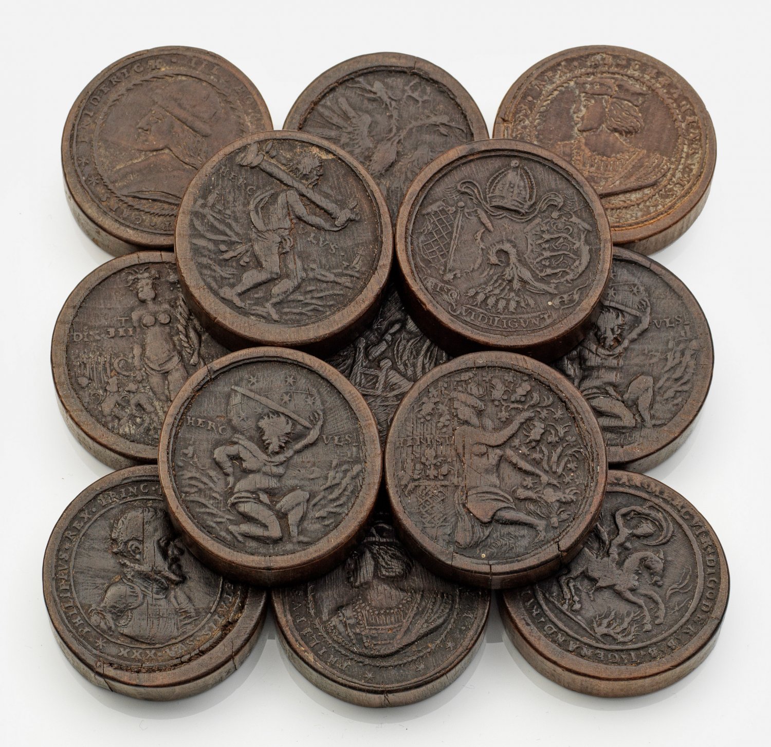Barock-Spielsteine für Dame und Mühle 13-tlg.; Holz gedrechselt und dunkel gebeizt. Runde, unterschiedlich geprägte Spielsteine. U. a. allegorische Darstellungen des Monats Mai, der Jahreszeiten Herbst und Winter sowie Herkules, die Erdkugel tragend bzw. mehrere europäische Herrscherporträts, z. B. von Maria und Maximilian von Böhmen, Philipp II. König von Spanien oder Kaiser Friedrich III.; Minim. Risse. D. 4,5 cm.
