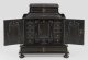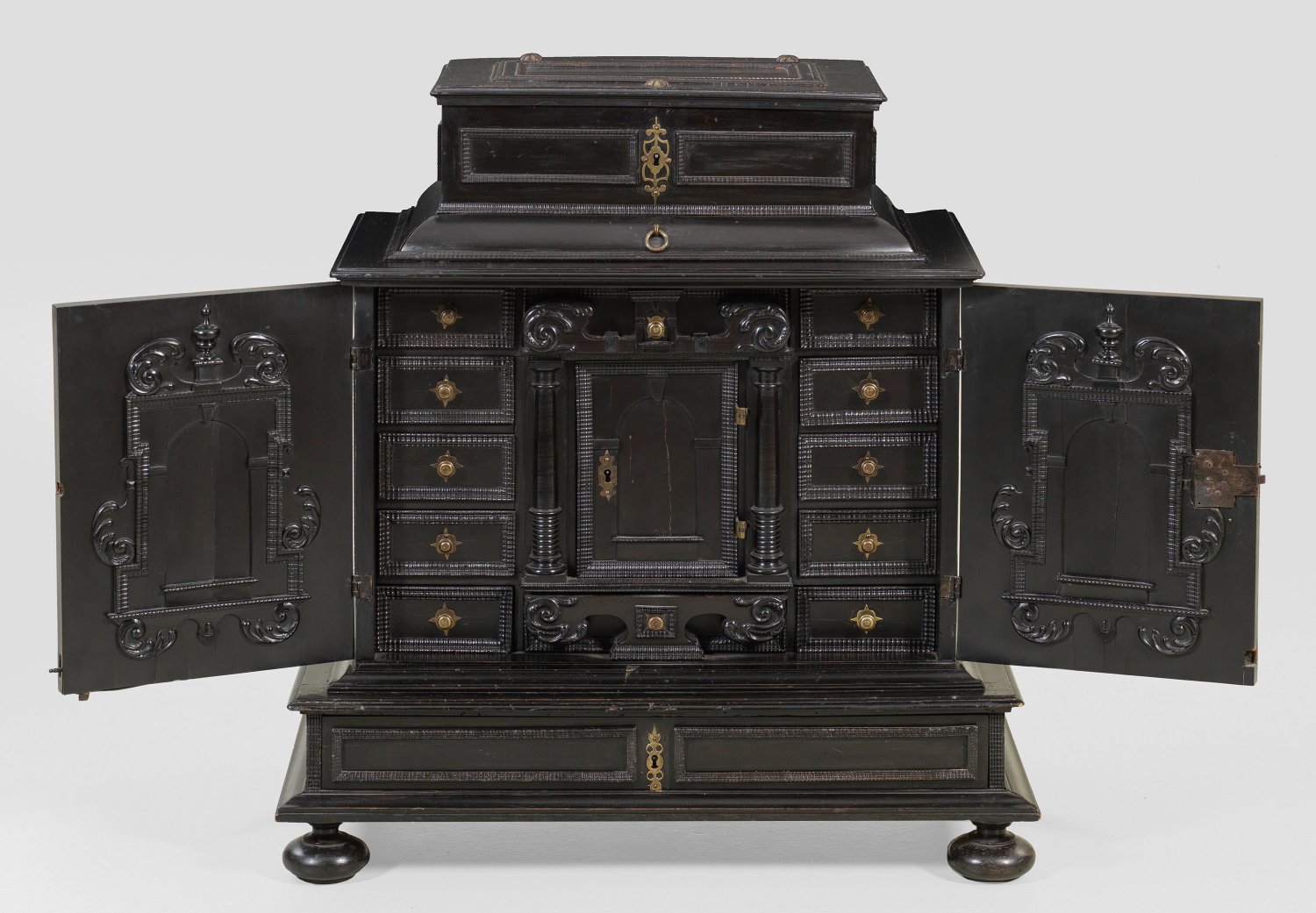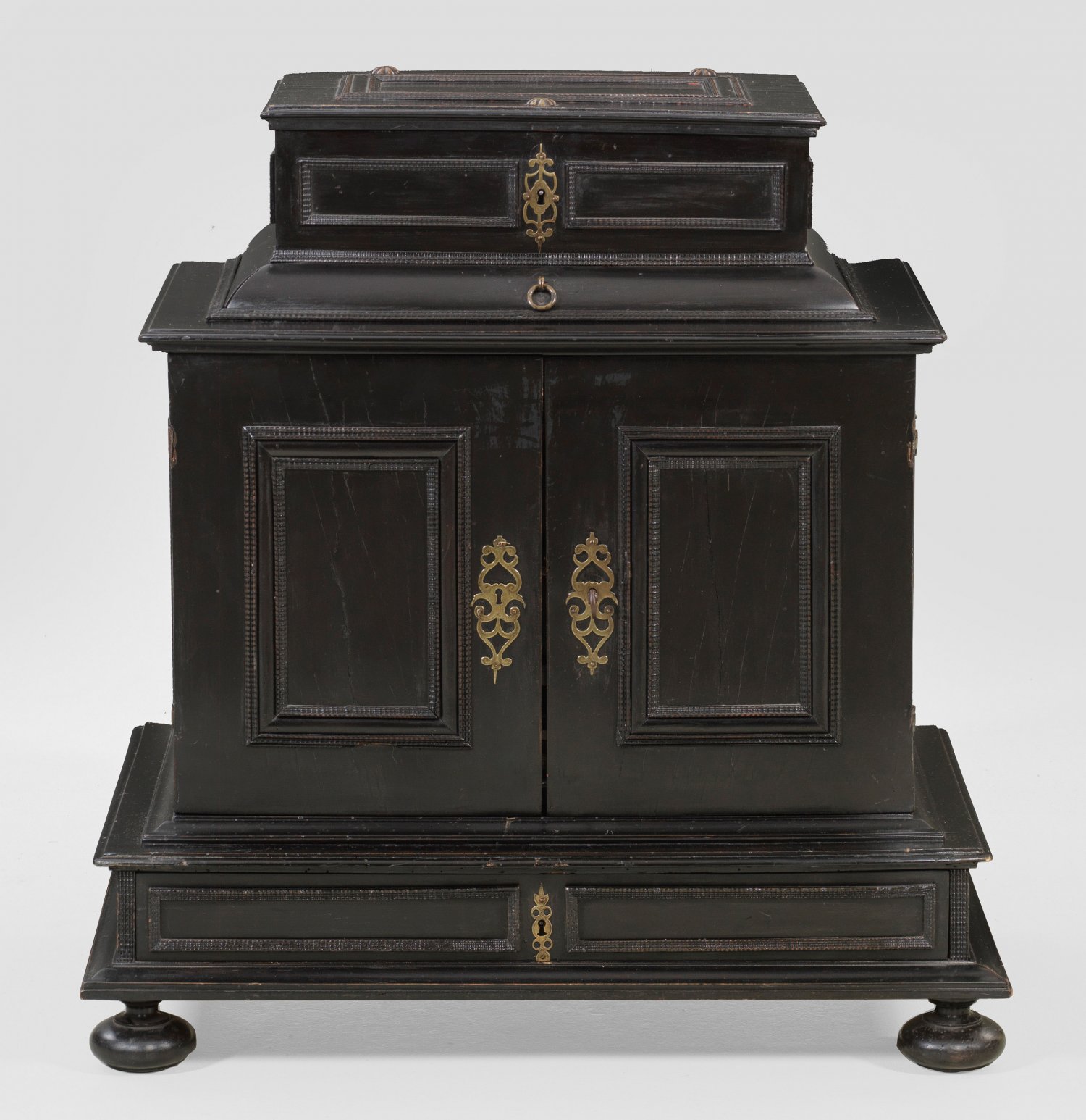 Qualitätvolles Barock-Tischkabinett Holz, ebonisiert. Profilierter, einschübiger Zargenkasten auf gedrückten Kugelfüßen. Oberhalb querrechteckig angelegter, flach kassettierter Korpus mit gestuft ansteigendem, podestförmigem, einschübigem oberen Abschluss mit aufklappbarer Deckplatte. In der gegliederten Front zwei Türen mit schmalen Flammleisten. Dahinter architektonisch gegliederte Kabinetteinteilung aus zentraler, von eingestellten Halbsäulen flankierter Tür, umgeben von diversen Schubladen unterschiedlicher Größe mit korrespondierenden Flammleistenprofilen. Durchbrochen gearbeitete Schlüsselschilder aus reliefiertem Messing. H. 63 cm. 61,5 cm x 36 cm.
