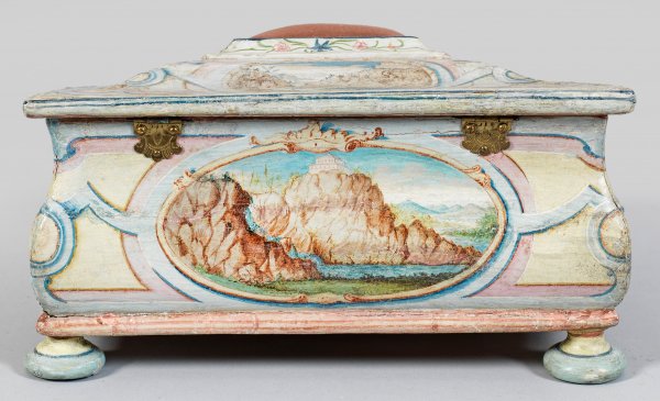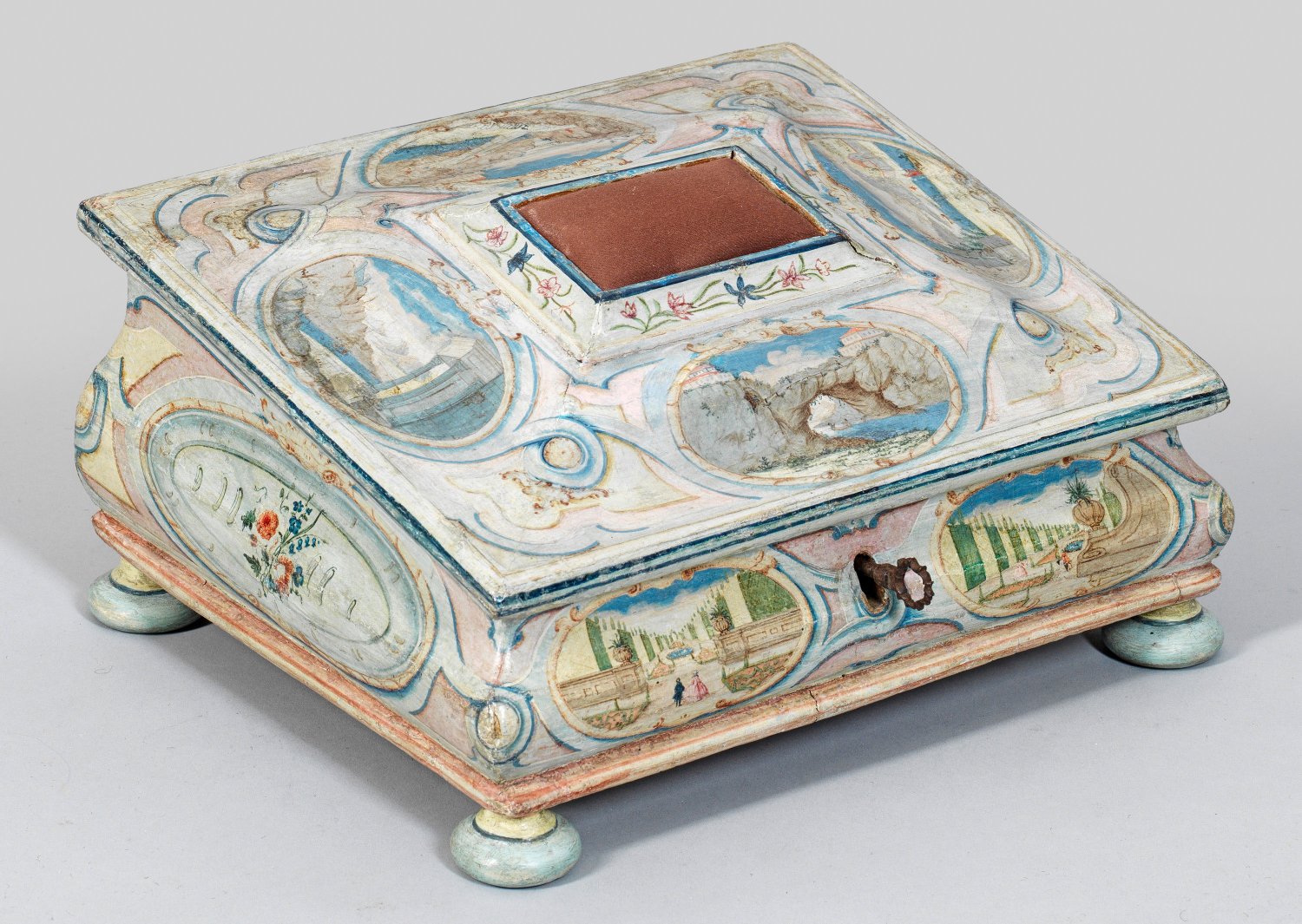 Barock-Schatulle Holz, cremefarben gefasst und polychrom bemalt. Bombierter Korpus auf schmaler Zarge und gedrückten Füßen. Schräggestellter, geschweift ansteigender Deckel mit zentriert angeordnetem Nadelkissen. Innen zwei Schubfächer und gestreckte Lade. Allseitig flächendeckender Dekor aus verschlungenen Volutenmotiven in zarten Pastelltönen als Rahmung für querovale Medaillons mit unterschiedlichen Landschaftsdarstellungen, Ruinenarchitektur, Parkanlagen und Blüten. H. 14 cm. 28 cm x 23 cm.
