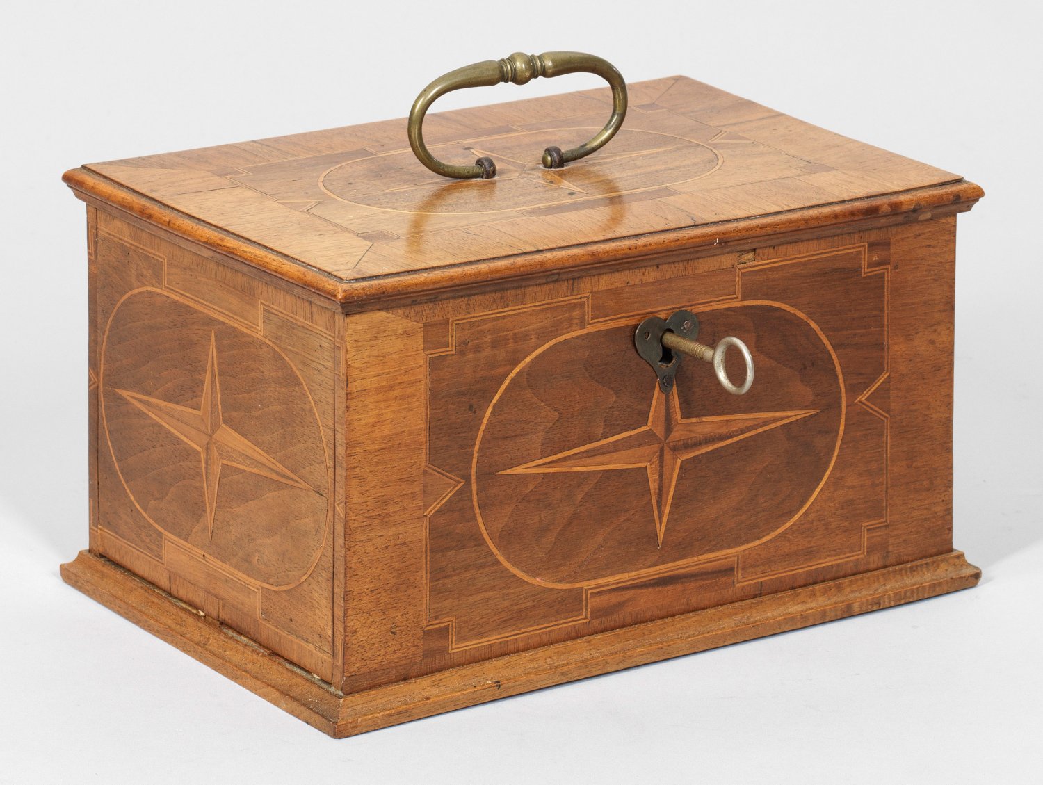 Barock-Schatulle mit Geheimfächern Nussbaum, furniert sowie Einlagen aus Ahorn. Gerader, querrechteckig angelegter Korpus auf schmaler Profilzarge mit entsprechendem Flachdeckel. Allseitig große Reserven mit Faltsternen. Innen sog. Hohe Kante sowie sechs Geheimschubladen. Erg.; H. 17 cm. 30,5 cm x 21 cm.