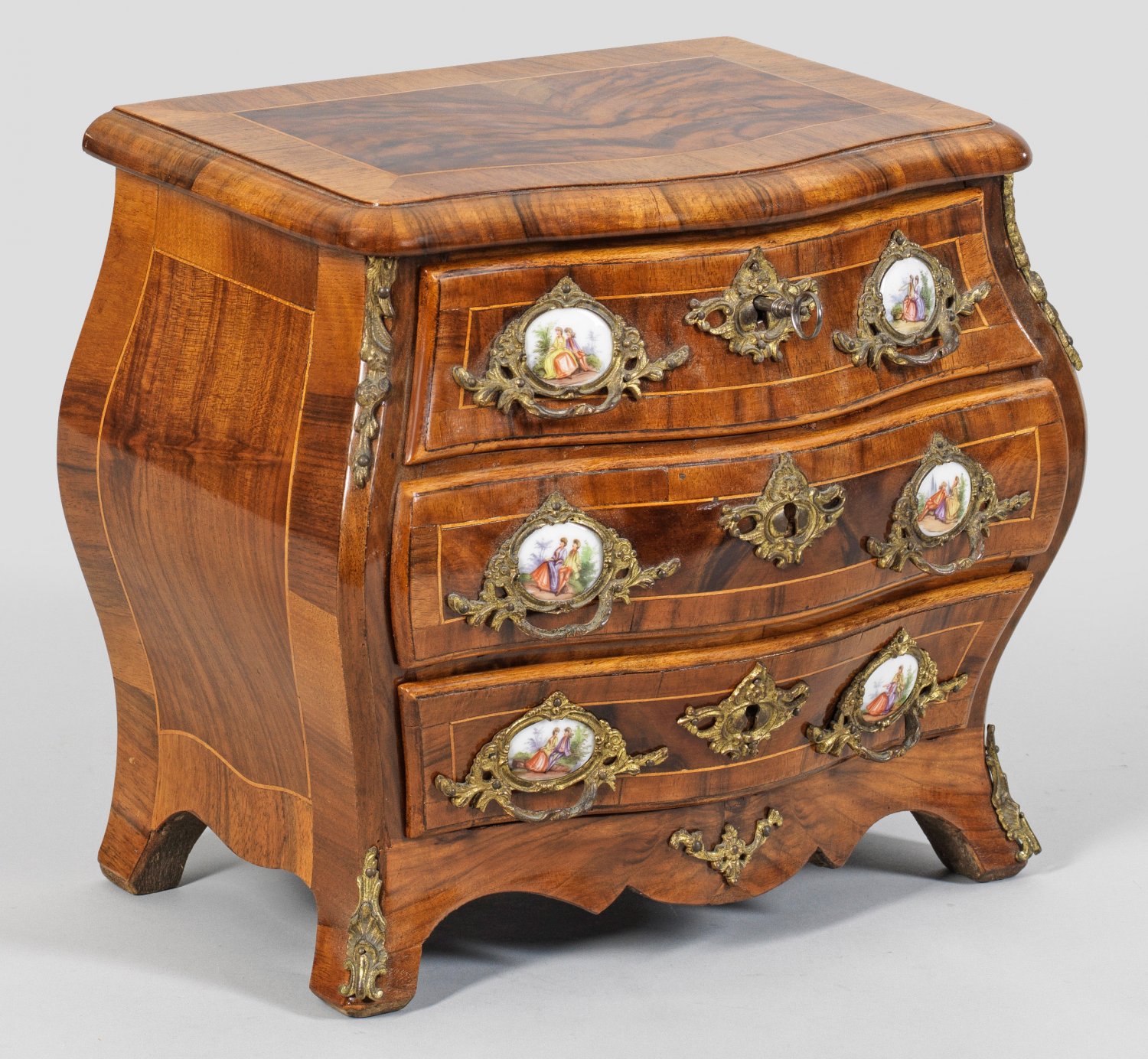 Dresdner Barock-Modellkommode Nussbaum, furniert sowie Applikationen aus Bronze und polychrom gestaltete Porzellan-Plaketten. Dreiseitig bombierter Korpus, flankiert von schmalen Ecklisenen, in ausgestellte Beine übergehend. Gering überstehende, profilierte Deckplatte. Flächendeckend breit gerahmte Furnierfelder, von Fadeneinlagen begrenzt. H. 29 cm. 33 cm x 20 cm.
