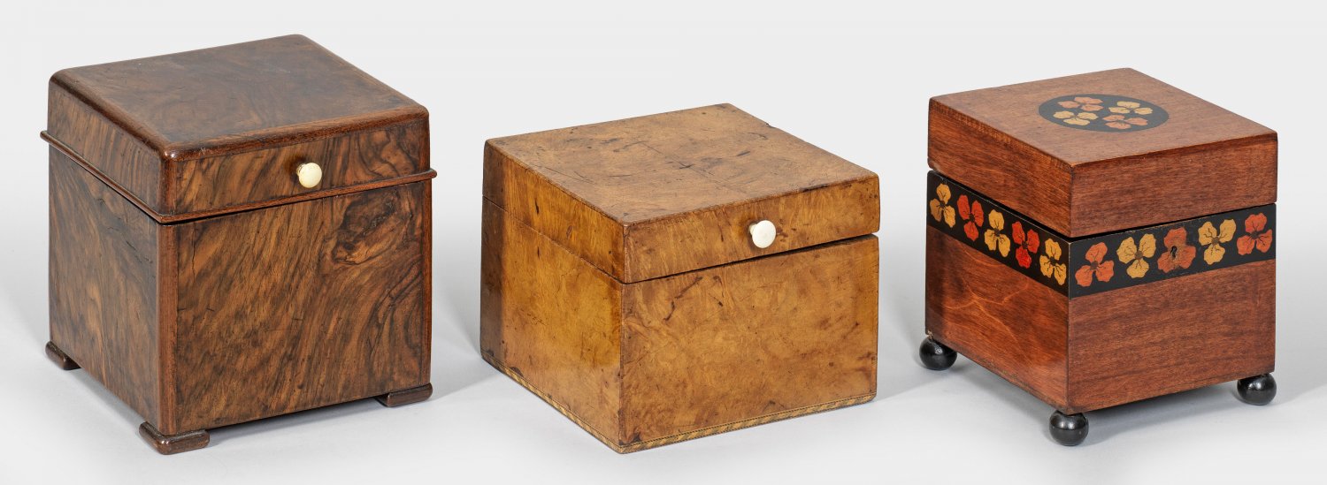 Drei Biedermeier-Tabakkästen Nussbaum und Ahorn, furniert bzw. farbig gebeizt. Gekanteter Korpus, teilw. auf kugelförmigen, bzw. gescheibten Füßen. Dem Korpus entsprechender aufklappbarer Deckel. Flächendeckende Furnierfelder sowie teilw. schablonierte Blütenelemente. H. 12,5 cm. 15,5 cm x 15,5 cm; H. 15 cm. 13,5 cm x 13,5 cm; H.16,5 cm. 16 cm x 16 cm.