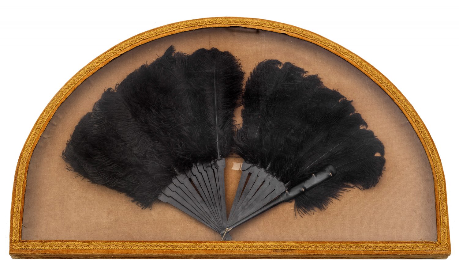 Dekorativer Fächer im Rahmen 17 Falt- und 2 Deckstäbe aus ebonisiertem Holz. Das Fächerblatt aus schwarzen Straußenfedern. Befestigt auf ockerfarbenem Samtstoff. Halbkreisförmiger Rahmen ebenfalls mit ockerfarbenem Samt bespannt und verziert mit gelber Posamentenborte. 72 cm x 42,5 cm.