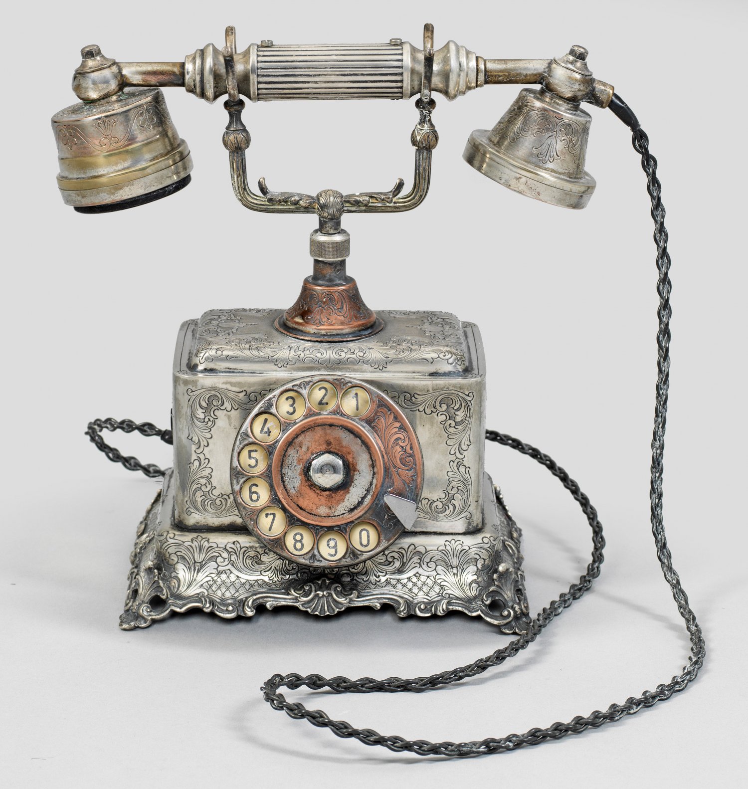 Telefonapparat im Rokoko-Stil Silber, teilw. Kupfer/Messing versilbert. Auf vier Rocaillefüßen getragener aufgewölbter Stand. Quaderförmiger Korpus, umzogen mit Gravuren im Rokokostil. Telefongabel, Telefon und Wählscheibe aus Kupfer bzw. Messing versilbert. Gest. 800, Meistermarke Wallé. Gew. ca. 2140 g. H. 24 cm.