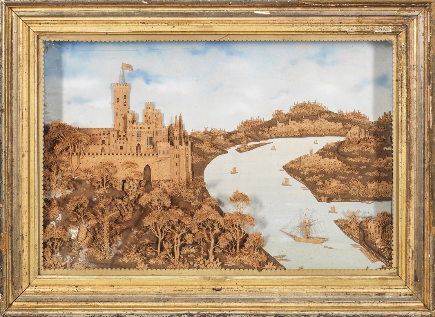 A fine German carved cork and gouache diorama of the Stolzenfels castle and the Rhine valley in original glass display case with gilt wood frame. Cracks to the glass of the display case.