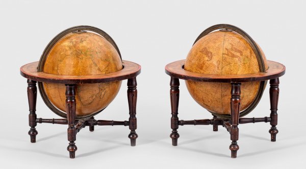 Paar seltene viktorianische Tischgloben Drehbare Erd- bzw. Himmelskugel mit lithographierten Kartenbildern. Je eingehängt in ein Holzgestell mit Balusterbeinen, teilw. ebonisiert. Die Beine durch gedrechselte Streben miteinander verbunden. Verschiebbare Vollkreismeridianringe aus Messing mit gravierten Messskalen und Gradeinteilungen sowie montierte Skalenringe mit Stundenzeiger. Breiter Äquatorialring aus Holz mit lithographierten Angaben zu Sternzeichen, Monaten und Himmelsrichtungen auf Papier.