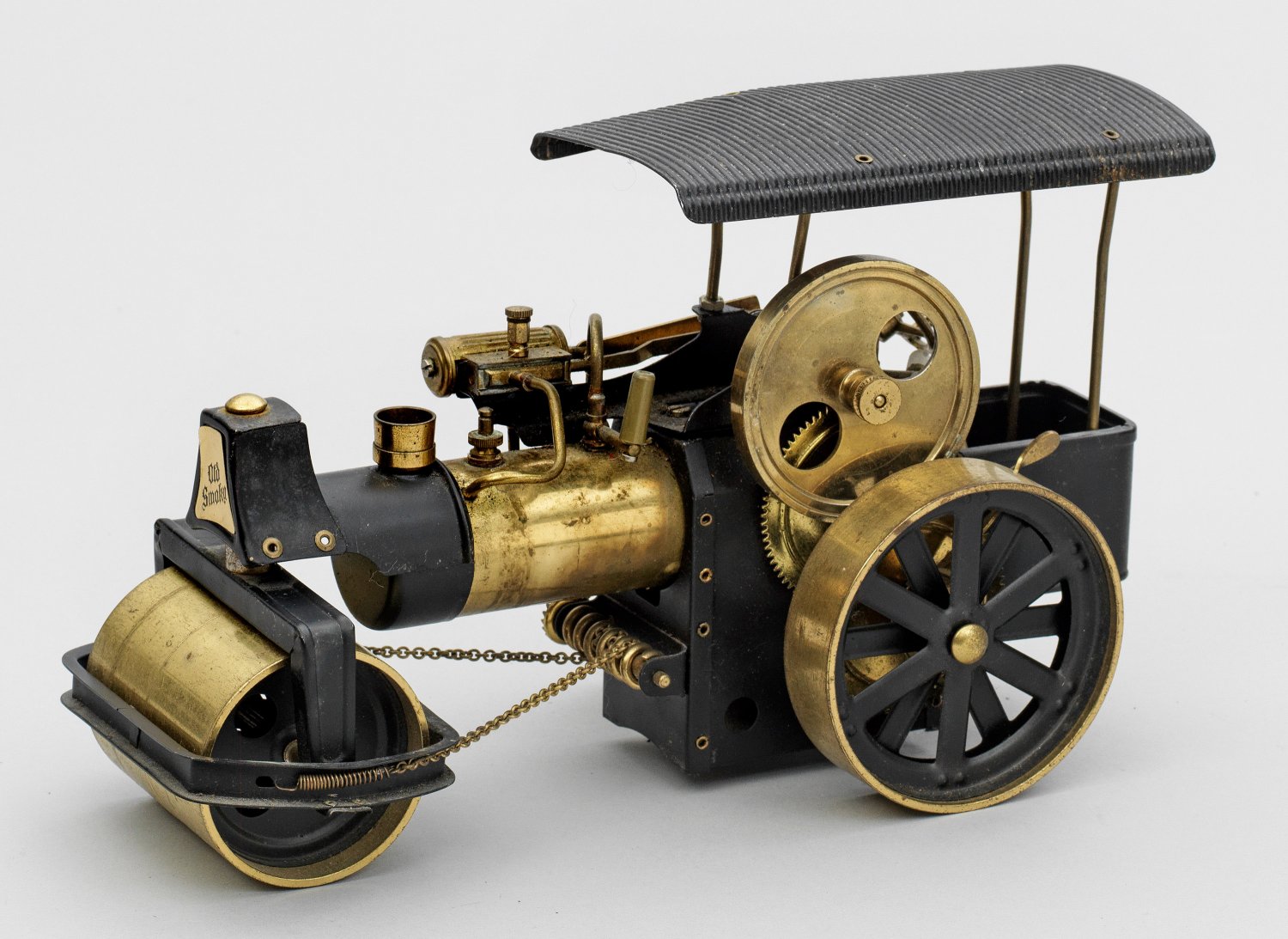 Dampfmaschine und Dampfwalze "Old Smoky" Blech, teilw. farbig lackiert bzw. Messing. Auf rechteckiger Sockelplatte liegender Dampfkessel mit Schornstein und Antriebsrad. Herstellerzeichen. H. 32 cm. 34 cm x 29 cm.; Walze mit lenkbarer Vorderachse, bez. made in W.-Germany. H. 19 cm. 33 cm x 14,5 cm. Bespielt.