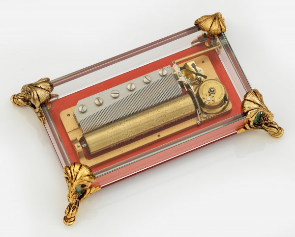 Gläserne Spieluhr von Reuge Dekorative, rechteckige, verglaste Spieldose mit vier vergoldeten Metallfüßen in Form von Delfinen. Sichtbares Walzenspielwerk. Mechanismus-Auslösung an der Außenseite. Herstellermarke. Melodie unten bez. "Hungarian Rhapsody (3 parts)" von Franz Liszt. H. 6,5 cm x 24 cm x 15 cm.