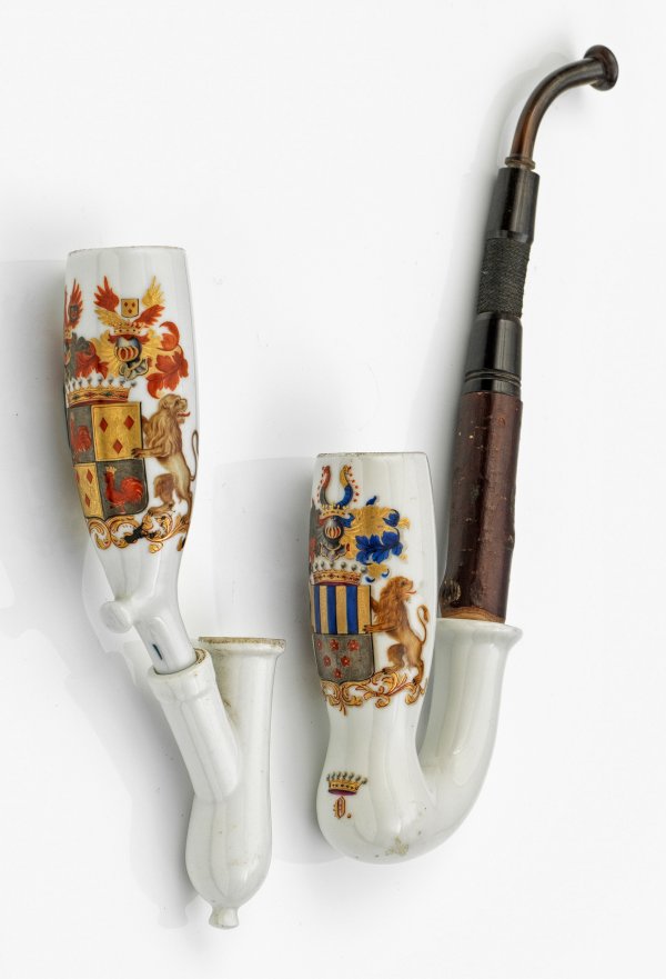 Porzellan. Schauseitiges Familienwappen der Grafen von Spee in der Aldenhof-Linie bzw. Wappen der Freiherrn von Brenken in feiner, polychromer und goldradierter Malerei. Rückseitige Widmung, bez. und dat. Bonn "1843" bzw. "1849". Teilw. Pfeifenrohr aus Holz mit Mundstück aus Horn. Teilw. Manufakturmarke. L. 12,5 cm - 14 cm.