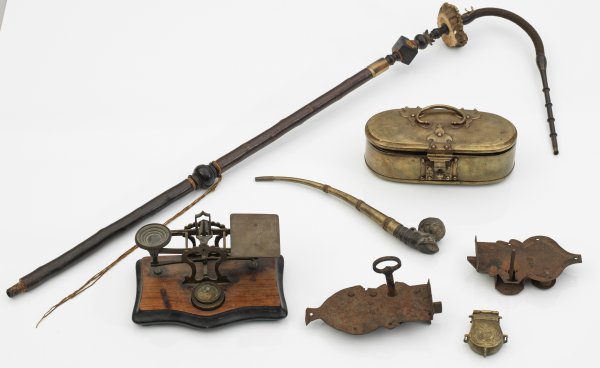 Konvolut Kuriositäten 7-tlg.; Messing, Holz, Horn, Geweih und Eisen. Ovale Henkeldose, kleine Waage auf Holzsockel, zwei Eisenschlösser mit Schlüsseln, etuiförmiges, graviertes Pulverfass, langes Pfeifenrohr sowie langstielige Pfeife. Altersspuren; 7 cm - 120 cm.