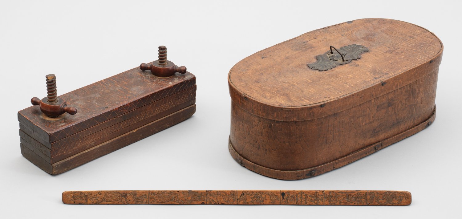 Spanschachtel und Utensilien 3-tlg.; Ovale Schachtel, dreiseitig gekantete Schneiderelle und kleine Schraubpresse. Holz, u. a. mit Metallbeschlag. Teilw. figürlicher Ritzdekor. L. 31 cm - 55 cm.