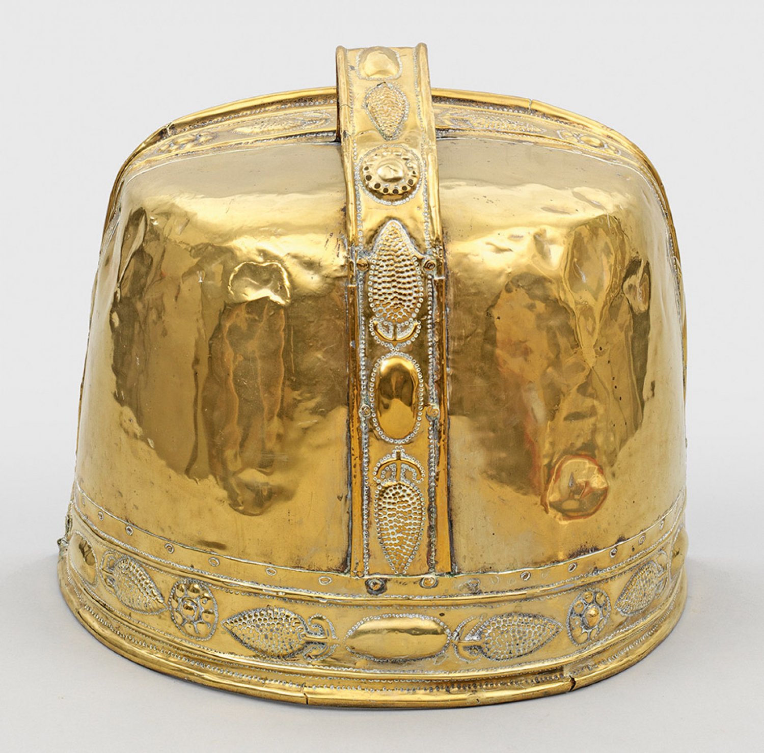 Norddeutsche Feuerstülpe Messing, getrieben und genietet. Korpus in Form einer halbierten Glocke mit umlaufendem, teilw. perforiertem Früchte- und Blumenband. Mittig angesetzter Griff als vertikales Band verlaufend. Alters- und Gebrauchsspuren. H. 41 cm.