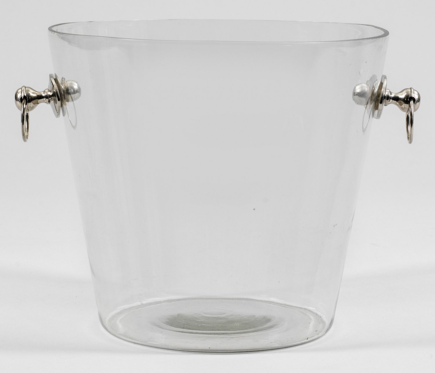Champagnerkühler Farbloses Glas und silberfarbenes Metall. Sich konisch weitender Korpus, seitlich mit ringförmigen Handhaben über ovaler Reserve. H. 26 cm.
