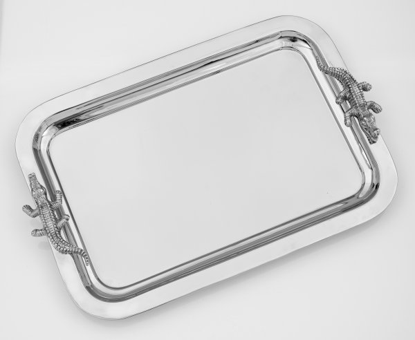 Tablett Versilbert. Rechteckige glatte Form mit gerundeten Ecken, an den Schmalseiten aufliegende, vollplastische, naturalistische Krokodile. B. 57 cm.