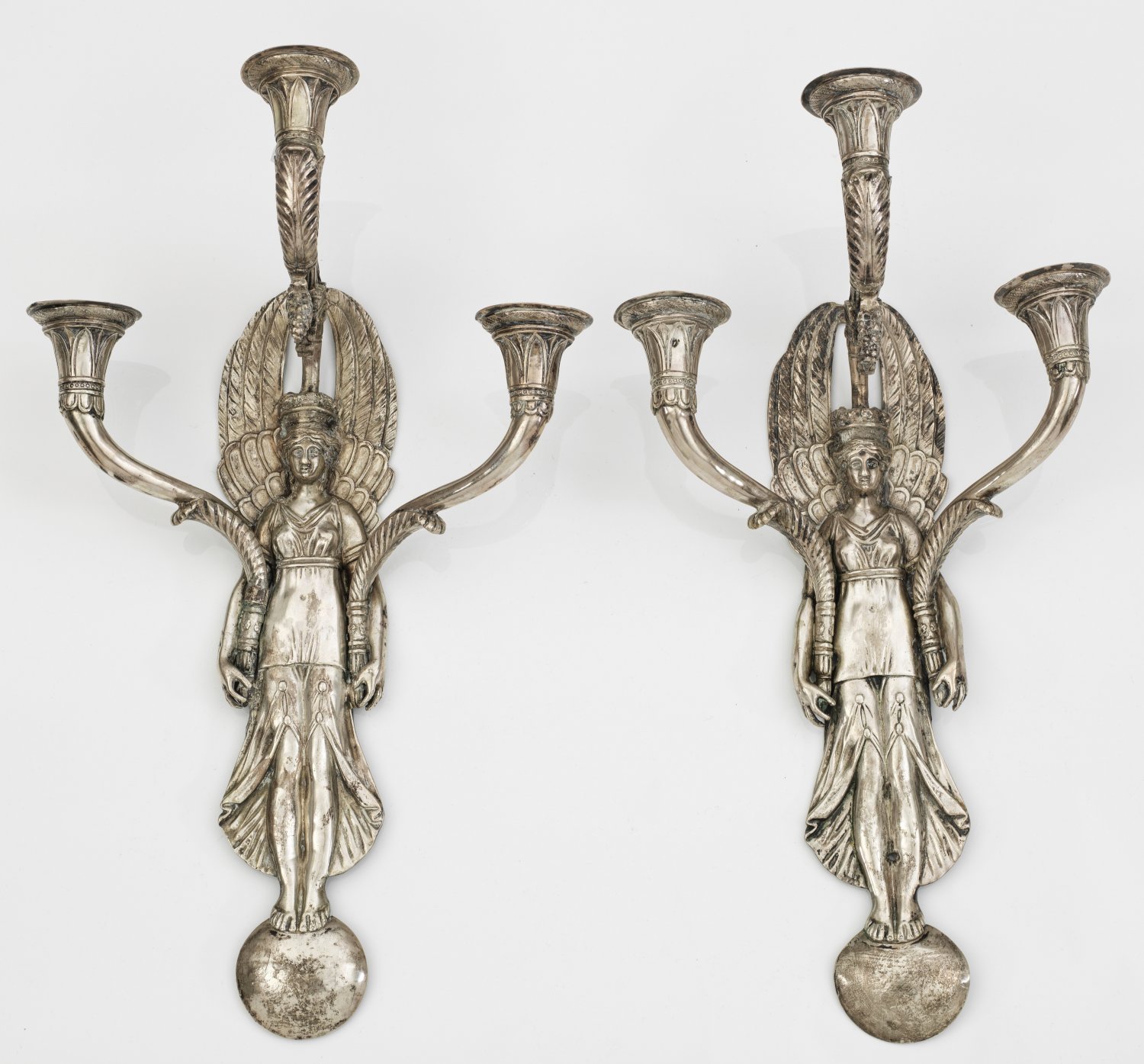 Paar Wandappliken im Empire-Stil 3-flg.; Silber. Plastisch gestaltete Wandschilder jeweils in Form der Siegesgöttin Viktoria als Trägerin für geschwungene seitliche Leuchterarme. Der obere Leuchterarm als Bekrönung ihres Kopfes, flankiert von ihren ausgebreiteten Flügeln und verziert mit vollplastischen Weinreben. Abschließend trichterförmige, mit Akanthusblättern verzierte Tüllen und flache Traufschalen. H. 47 cm.