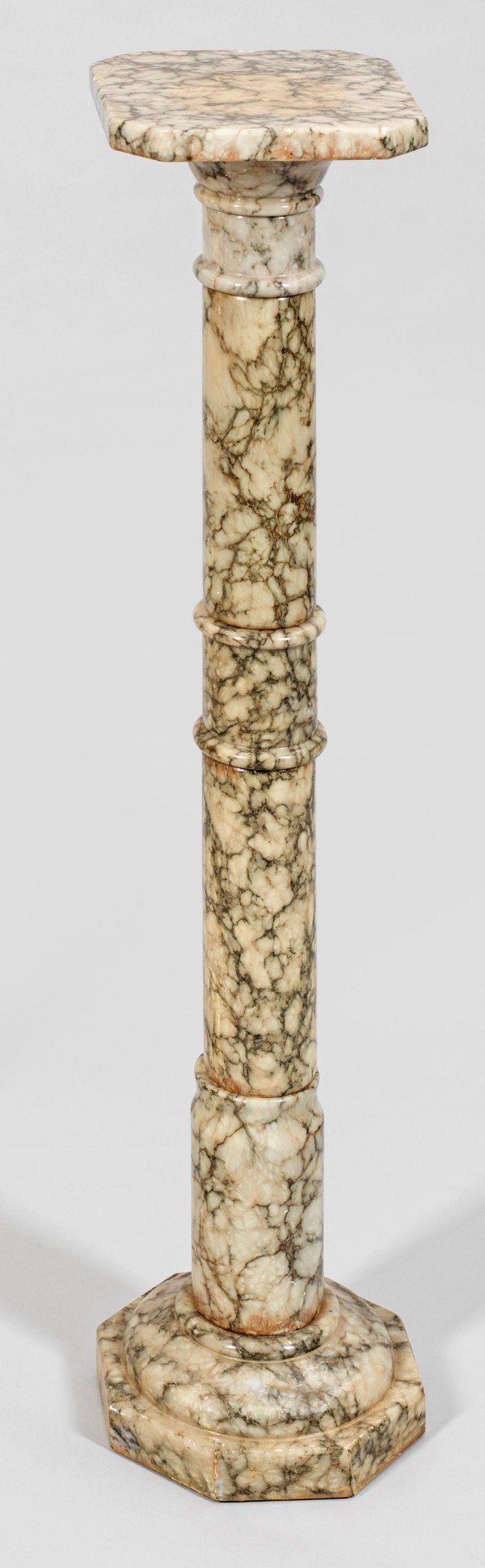 Skulpturensäule Cremefarbener, graugemaserter Marmor mit flächendeckendem Lacküberzug. Über gestuft ansteigender Sockelplatte mehrfach gegliederter Schaft als Träger für rechteckige Deckplatte. Minim. best.; H. 97,5 cm. 22 cm x 22 cm.