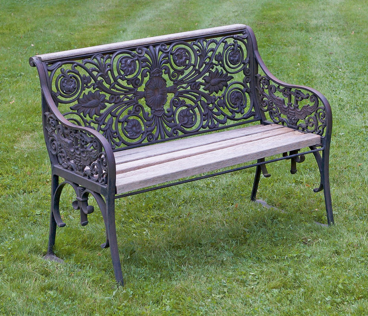 Gusseisen, geschwärzt sowie Holz. Durchbrochen gearbeitete, schmale Seitenwangen aus stilisierten Adlermotiven und Blattwerk, in leicht zurück schwingende Rückenlehne aus zentraler Blütenrosette und üppigen, eingerollten Blattvoluten übergehend. Sitzfläche und Lehnenabschluss aus gekanteten Stegen. Altersspuren. H. 83 cm. 107 cm x 58 cm. Sitz-H. 42 cm.