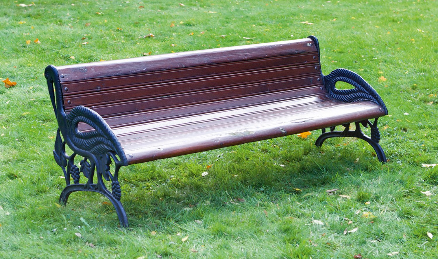 Große Parkbank Gusseisen, schwarz lackiert sowie rotbraun lasiertes Holz. Flache, durchbrochen gearbeitete Seitenwangen in Form von reliefierten Pelikanen und stilisierten Reben auf gebogten Streben. Geschweifte Sitzfläche aus dicht angeordneten Stegen, in entsprechende Rückenlehne übergehend. H. 72 cm. 185 cm x 58 cm. Sitz-H. 38 cm.