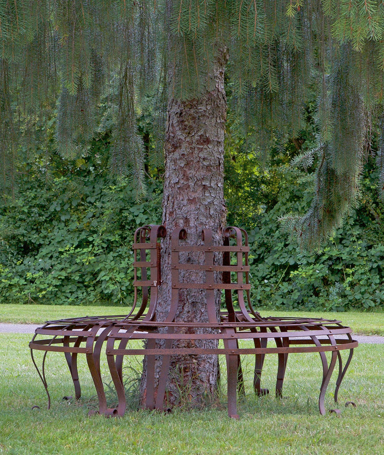 Baumbank 2-tlg.; Eisen mit Rostpatina. Runder, durchbrochen gestalteter Korpus aus volutenförmig geschwungenen, flachen Streben sowie entsprechenden Stegen für Sitz- und Lehnenfläche. H. 90 cm. D. 152 cm.