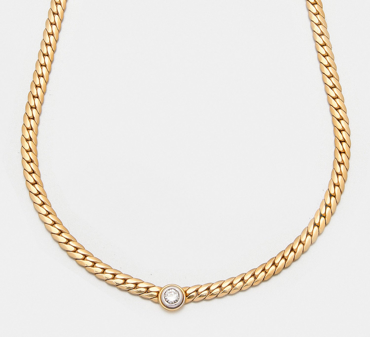 Klassisches Brillant-Solitär-Collier Gelbgold, gest. 750. Flachpanzer-Kette, zentral besetzt mit einem Brillanten von ca. 0,50 ct. (F-G/IF-vvs). Gew. ca. 48,84 g.