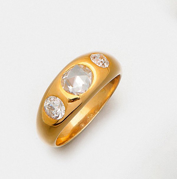 Klassischer Herren-Bandring mit Diamanten Gelbgold, 18 ct. Zentral besetzt mit einer Diamantrose von ca. 0,70 ct. (H/vsi), flankiert von zwei korrespondierenden Diamanten von zus. ca. 0,50 ct. (H/si). Gew. ca. 9,93 g.
