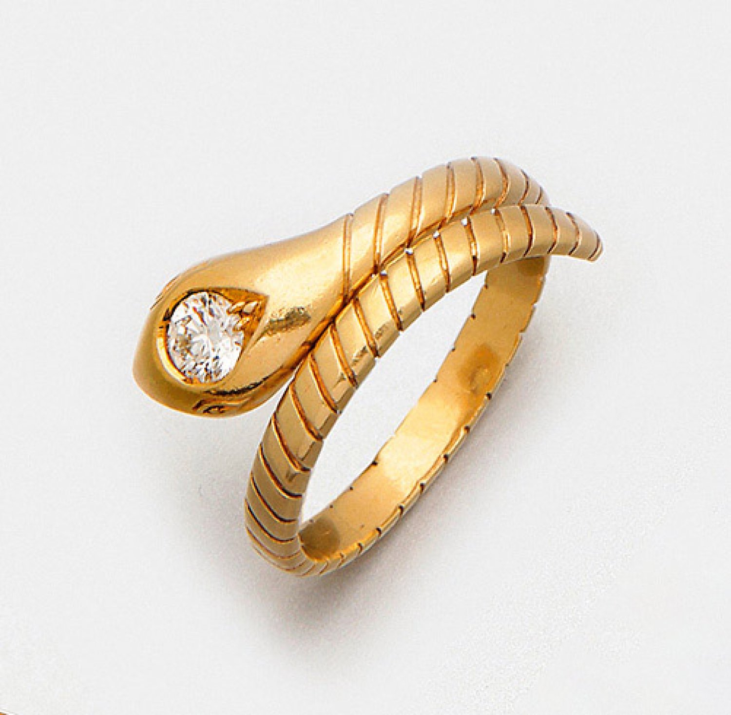 Herren-Schlangenring mit Brillant-Solitär Gelbgold, 750. Schlangenkopf besetzt mit einem Brillanten von ca. 0,50 ct. (I-J/vvs). Gew. ca. 8,66 g.