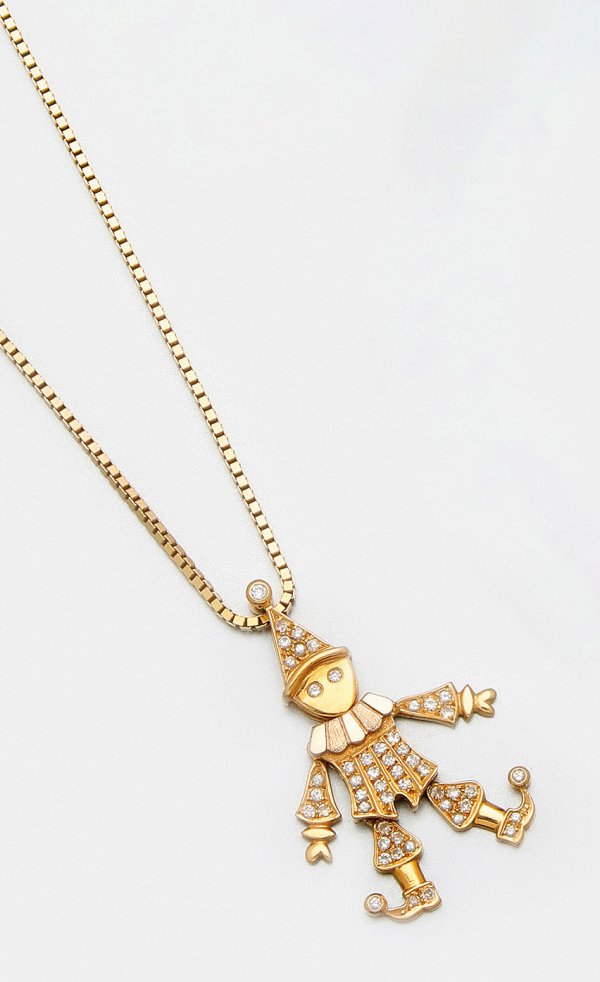 Harlekin-Anhänger mit Kette Gelbgold, gest. 750. Beweglicher Anhänger, schauseitig besetzt mit Diamanten von zus. ca. 0,50 ct.; Überlange Milanese-Kette. Gew. ca. 17,00 g.