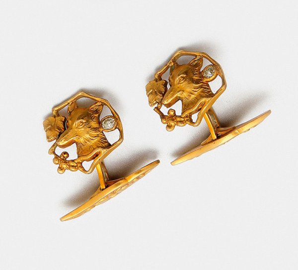 Paar russische Manschettenknöpfe aus der letzten Zarenzeit Russland. Um 1908-1917. Gelbgold, gest. 56 (583). Boutons in Form von reliefplastisch gearbeiteten Fuchsköpfen, Blattwerk und Blütenrosetten, akzentuiert durch zwei Diamantrosen. Ges.-Gew. ca. 6,04 g.