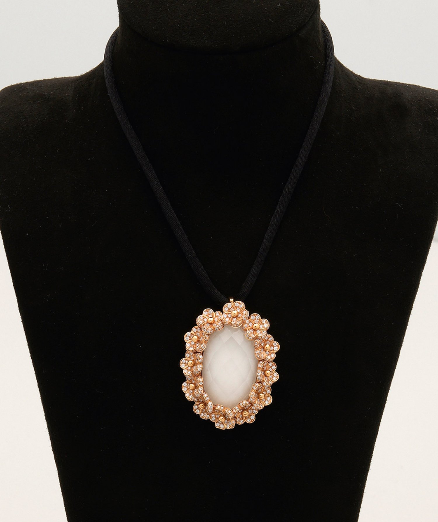 A pendant by Meissen "My little Mystery" set with rock crystal on white porcelain and diamonds approx. 4,20 ct. (F-G/vvsi), in 18 k red gold. Manufacturer's mark.
