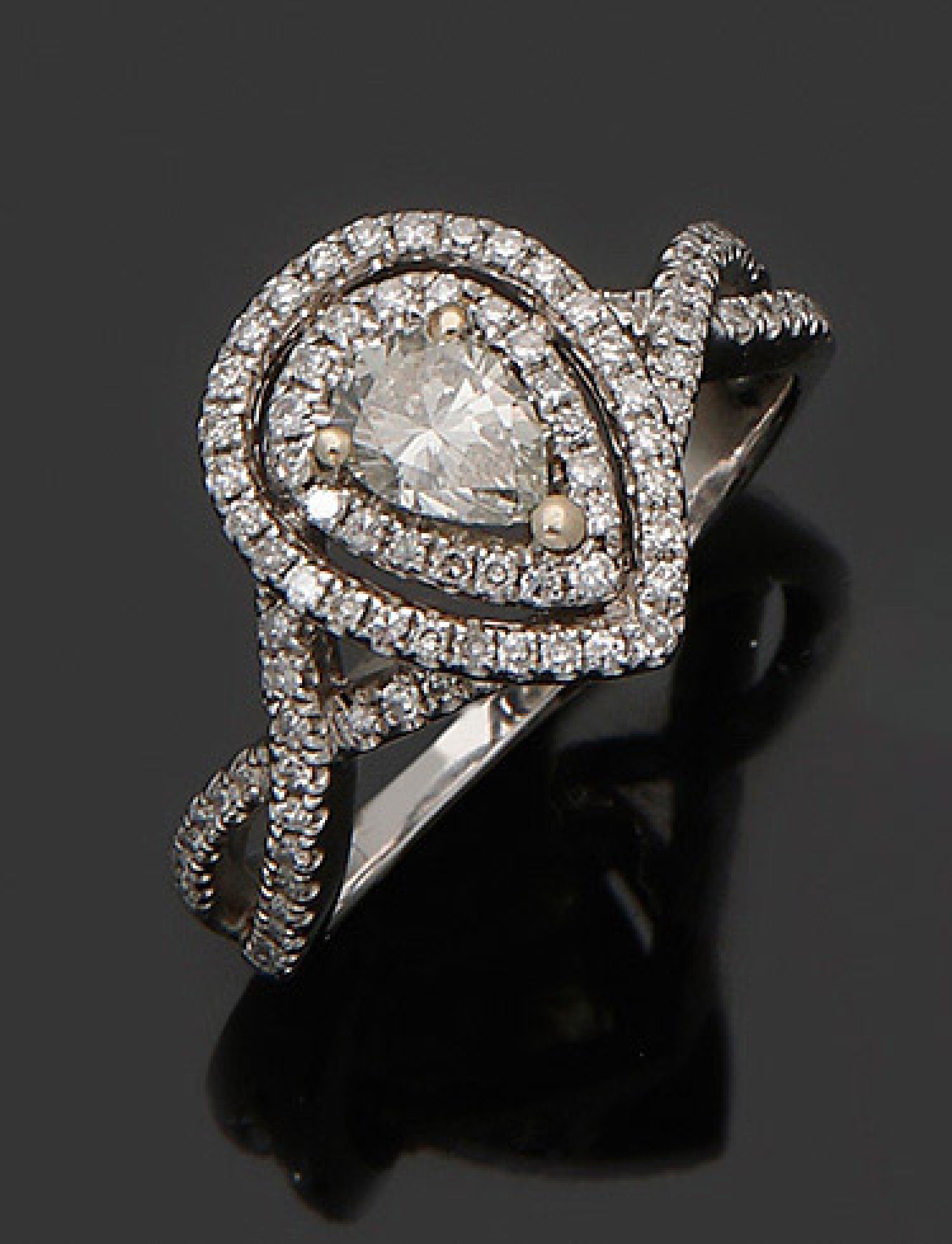 Feiner Diamantring Weißgold, gest. 14 ct.; Zentral besetzt mit einem Diamanttropfen von ca. 0,50 ct. (O/vs) entouriert von kleinen Diamanten von zus. ca. 0,90 ct.; Gew. ca. 3,20 g.