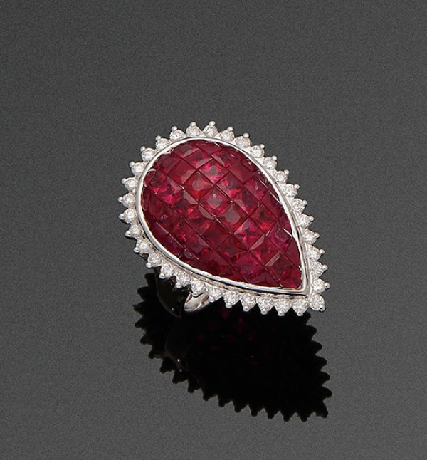 Hochfeiner Rubinring im Stil von Van Cleef & Arpels Weißgold, gest. 750. Tropfenförmiger Ringkopf, besetzt mit taubenblutroten Rubinen von zus. ca. 5,16 ct. im Carréeschliff in sog. "Invisible Setting", umrahmt von kleinen Brillanten von zus. ca. 0,64 ct. (G-H/vs); Gew. ca. 9,25 g.