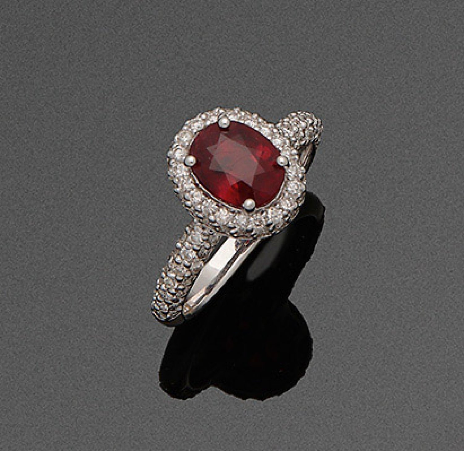 Klassischer Rubin-Brillantring Weißgold, gest. 750. Zentral besetzt mit einem rot-braunen Rubin von ca. 2,26 ct. im Ovalschliff, entouriert von Brillanten von zus. ca. 0,74 ct. (H/vsi). Gew. ca. 4,92 g.