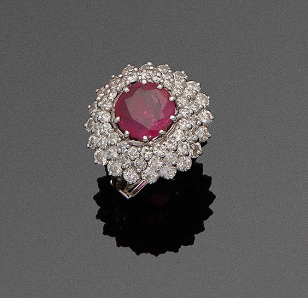 Eleganter Rubin-Cocktailring Weißgold, 14 ct.; Zentral besetzt mit einem taubenblutroten Rubin von ca. 3,00 ct., entouriert von Brillanten von zus. ca. 3,50 ct. (H-J/vs-si-pi). Gew. ca. 8,11 g.