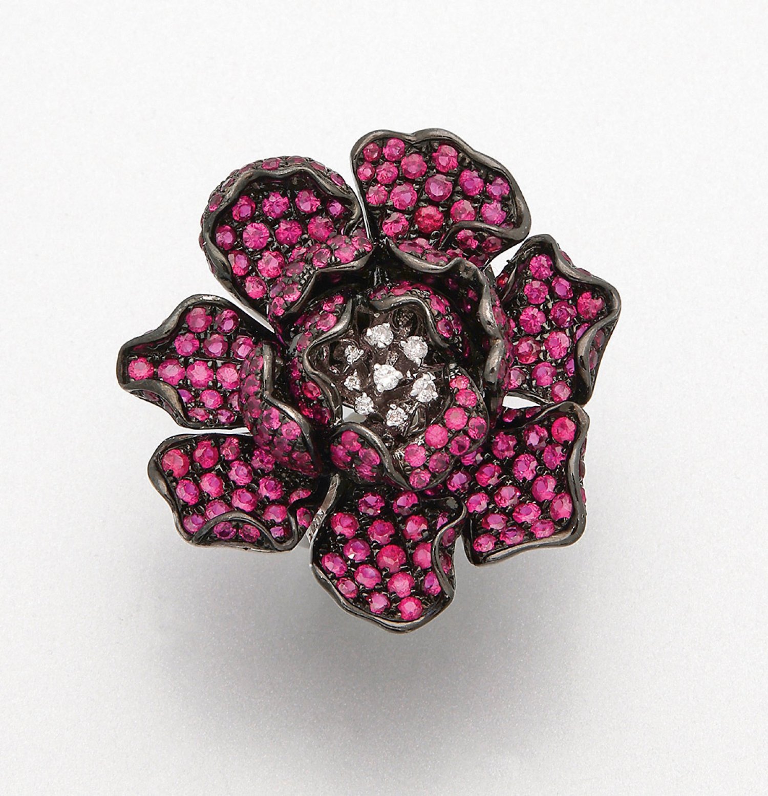 Extravaganter Rosenblütenring mit Rubinen Weißgold, teilw. schwarz rhodiniert, gest. 750. Plastisch gestalteter Rosenblütenkopf besetzt mit dunkelpinkfarbenen Rubinen von zus. ca. 7,70 ct. und Diamanten von zus. 0,10 ct.; Gew. ca. 29,13 g.