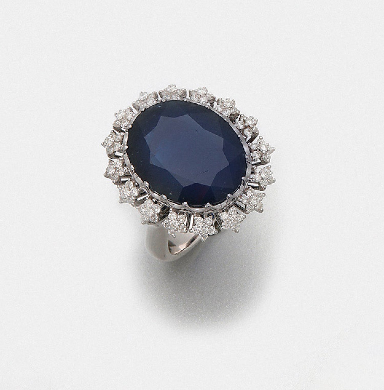Eleganter Entouragering mit Saphir Weißgold, gest. 750. Zentral besetzt mit einem tintenblauen Saphir von ca. 10,70 ct. im Ovalschliff, umzogen von Diamanten von zus. ca. 0,90 ct. in blütenförmiger Anordnung. Gew. 10,84 g.