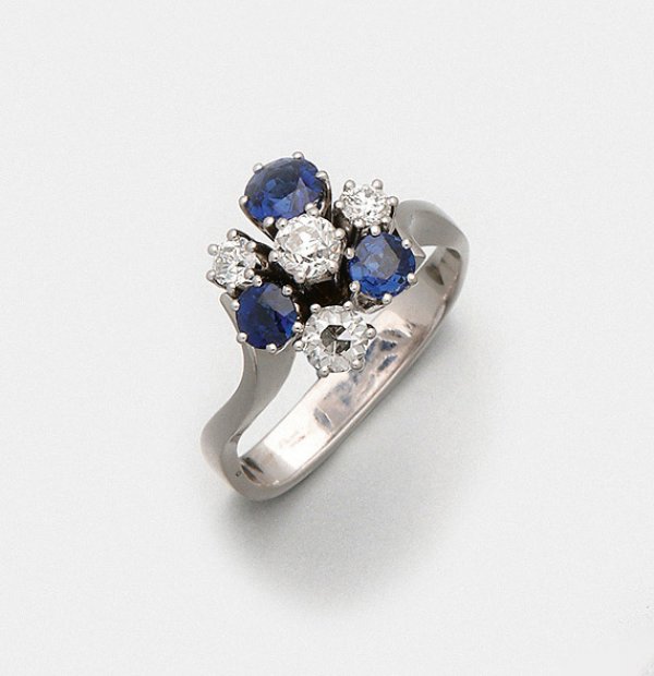 Repräsentativer Saphir-Brillantring Weißgold, gest. 750. Besetzt mit drei kornblumenblauen Saphiren von zus. ca. 1,50 ct. und vier Altschliffdiamanten von zus. ca. 0,95 ct. (H-J/vs-si). Gew. ca. 10,29 g.