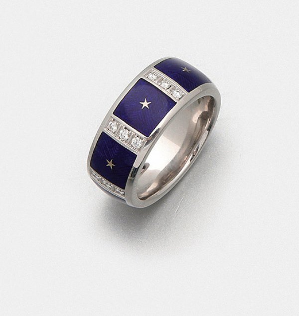 Bandring von Victor Mayer aus der Kollektion "Fabergé" Weißgold, teilw. royalblau emailliert, gest. 750. Schauseitig besetzt mit Brillanten von zus. 0,13 ct., unterteilt durch kleine eingelegte Sterne. Limitierte Auflage 1/500. Herstellerzeichen. Gew. ca. 13,21 g.
