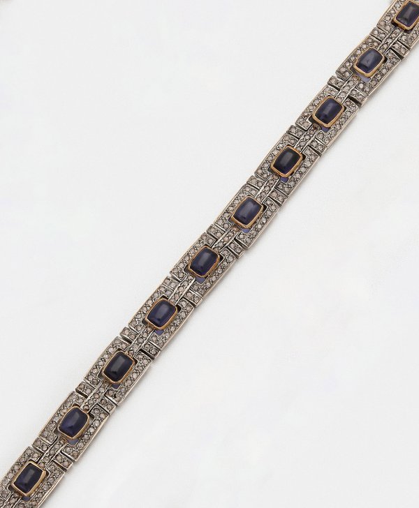 Belle Epoque-Saphir-Diamantarmband Silber, teilw. Gelbgold, doubliert. Schauseitig besetzt mit insges. zehn Saphircabochons von zus. ca. 6,00 ct., ausgefasst mit Diamantrosen von zus. ca. 2,00 ct.; Gew. ca. 30,21 g.