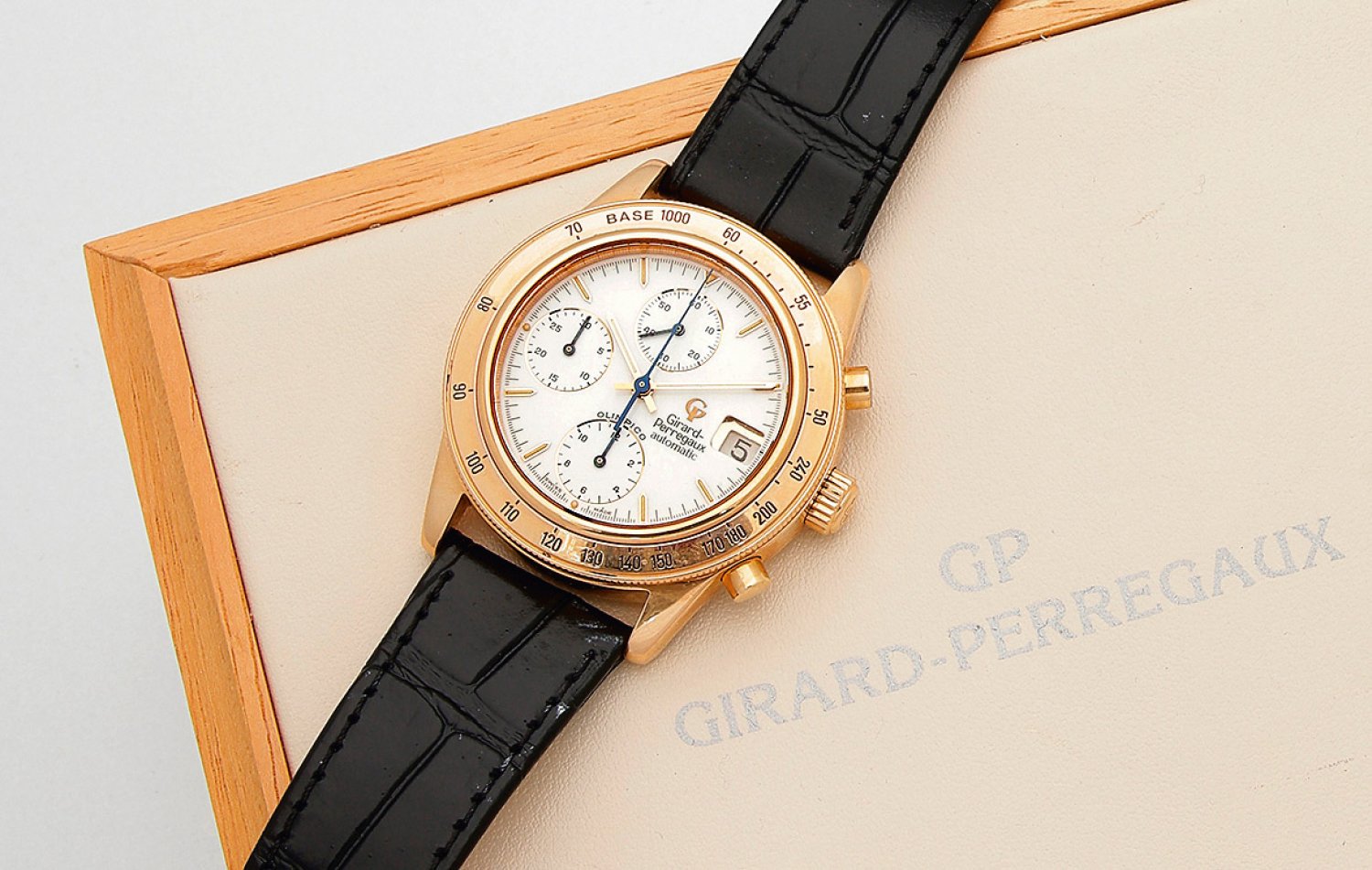 Herrenarmbanduhr von Girard Perregaux-"Olimpico" von 1992" Roségold, gest. 750. Rundes, profiliertes Uhrengehäuse mit aufgesetzter Tachymeterskala und verschraubtem Boden. Weißes Zifferblatt mit Stabindex und Zeigern mit Tritiumauflage, Stundenzähler, Minutenzähler und kleiner Sekunde, Chronograph aus der Mitte. Saphirglas mit Lupenfenster für Datumsanzeige. Schwarzes Krokodillederarmband mit Gold-Dornenschließe. Mechanisches Werk mit automatischem Aufzug. No. OR-333. Original Box und Uhrenpass. Nahezu neuwertig. Neupreis ca. € 27.500.-.