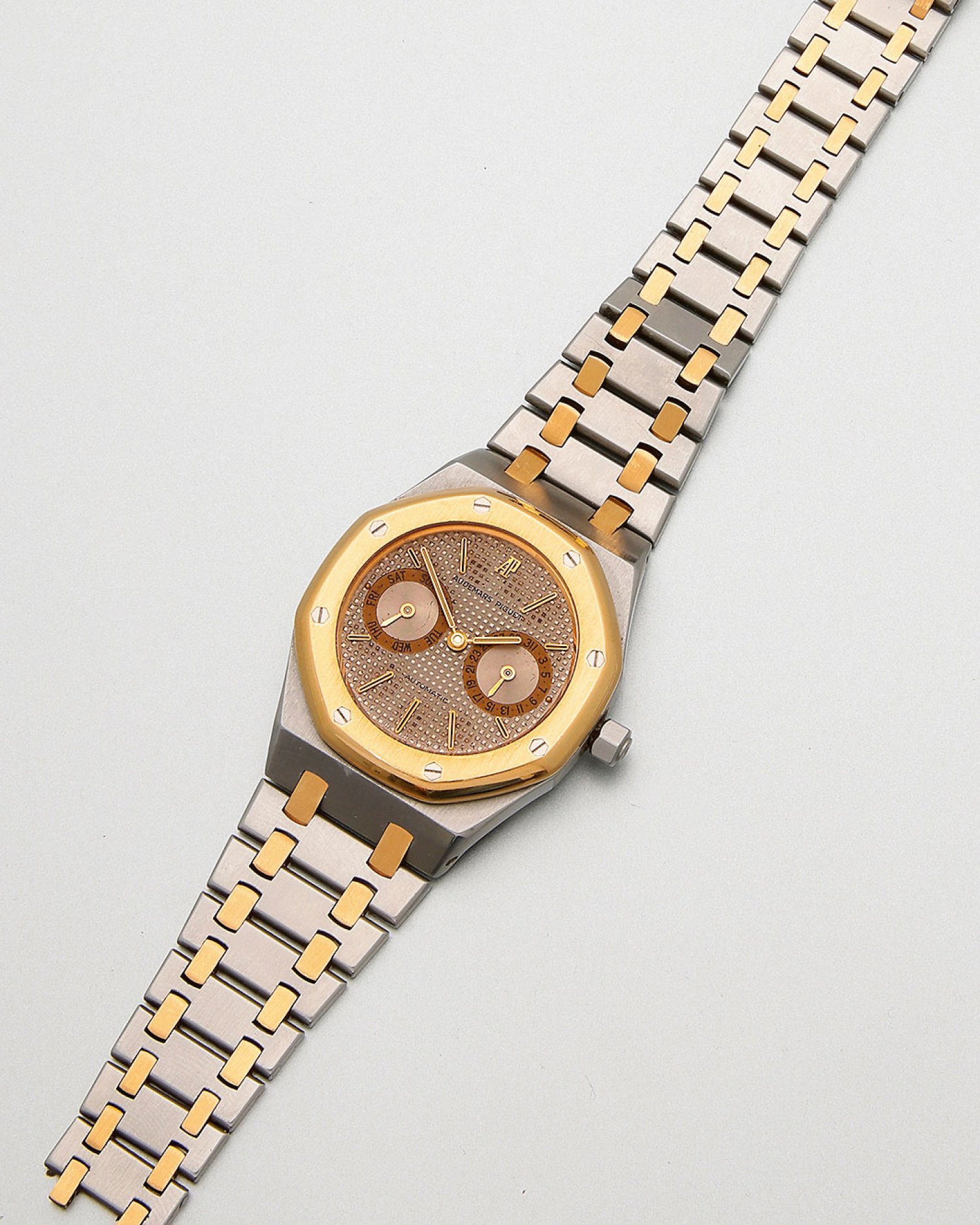 Stahl und Gelbgold. Rundes Uhrengehäuse mit aufgeschraubter, oktogonaler Lunette. Zifferblatt mit "Clous de Paris"-Dekor, goldenenen Stab-Indexen und Zeigern. Saphirglas. Automatikwerk. Gliederarmband mit Faltschließe. No. 114. Herstellerzeichen. Original Box und Uhrenpass.