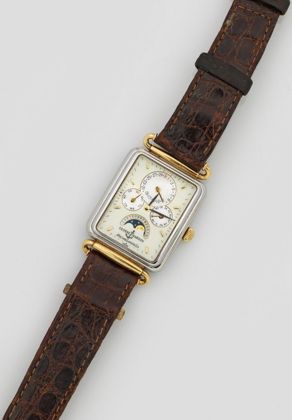 Herrenarmbanduhr von Ulysse Nardin-"Michelangelo" Stahl, mit Gelbgold verbödet. Rechteckiges, profiliertes Gehäuse mit verglastem Boden, weißes Zifferblatt mit Gold-Indexen und schwarzen Lanzenzeigern, Kalender, Wochen-, Datums- und Mondphasenanzeige. Braunes Krokodillederarmband mit Gold-Dornenschließe. Automatikwerk. Herstellerzeichen. Original Uhrenpass.