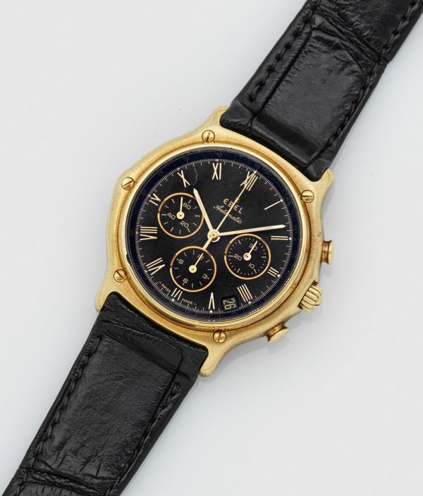 Gelbgold, gest. 750. Rundes, verschraubtes Uhrengehäuse, schwarzes Zifferblatt mit goldenen, römischen Zahlen, kleiner Sekunde, Stunde und Datumsanzeige. Korrespondierendes Ebel-Lederarmband mit Stahlfaltschließe. Automatikwerk mit Chronograph. Ref.-Nr. 887902. Garantiekarte.