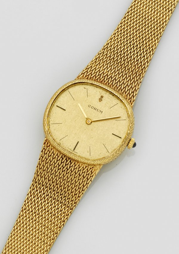Herrenarmbanduhr von CORUM aus den 80er Jahren Gelbgold, gest. 750. Tonneauförmiges Uhrengehäuse, satiniertes Zifferblatt mit Stabindexen und Zeigern. Leicht verlaufendes Milanese-Armband mit Faltschließe. Mechanisches Werk mit Handaufzug, Krone mit Saphircabochon besetzt. Gew. ca. 98,33 g.