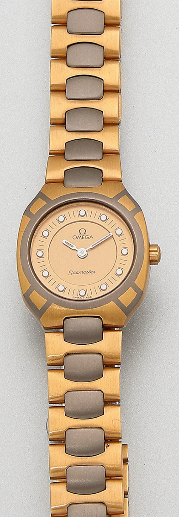Damenarmbanduhr von Omega-"Seamaster" aus den 80er Jahren Titan und Gelbgold, 18 ct.; Rundes Uhrengehäuse, Zifferblatt mit aufgelegten Indexen und Stabzeigern mit Tritiumauflage. Gliederarmband mit verstellbarer Faltschließe. Quarzwerk. Herstellerzeichen.