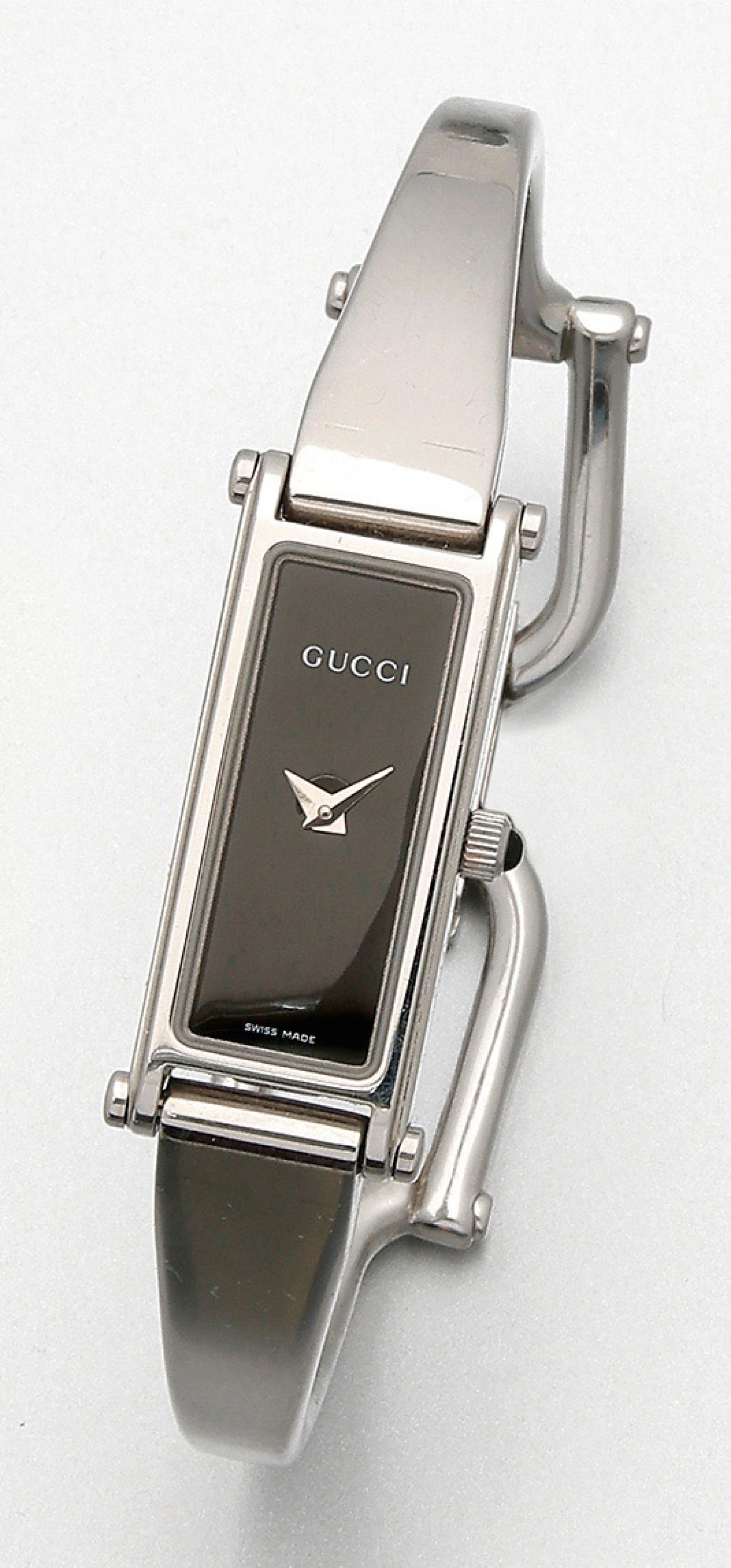 Damenarmbanduhr von GUCCI Stahl. Tankförmiges, gestrecktes Uhrengehäuse, schwarzes Zifferblatt, Lanzenzeiger. Leicht verlaufendes Spangenarmband mit steigbügelförmiger Schließe. Quarzwerk. Herstellerzeichen. Original Box und Uhrenpass.