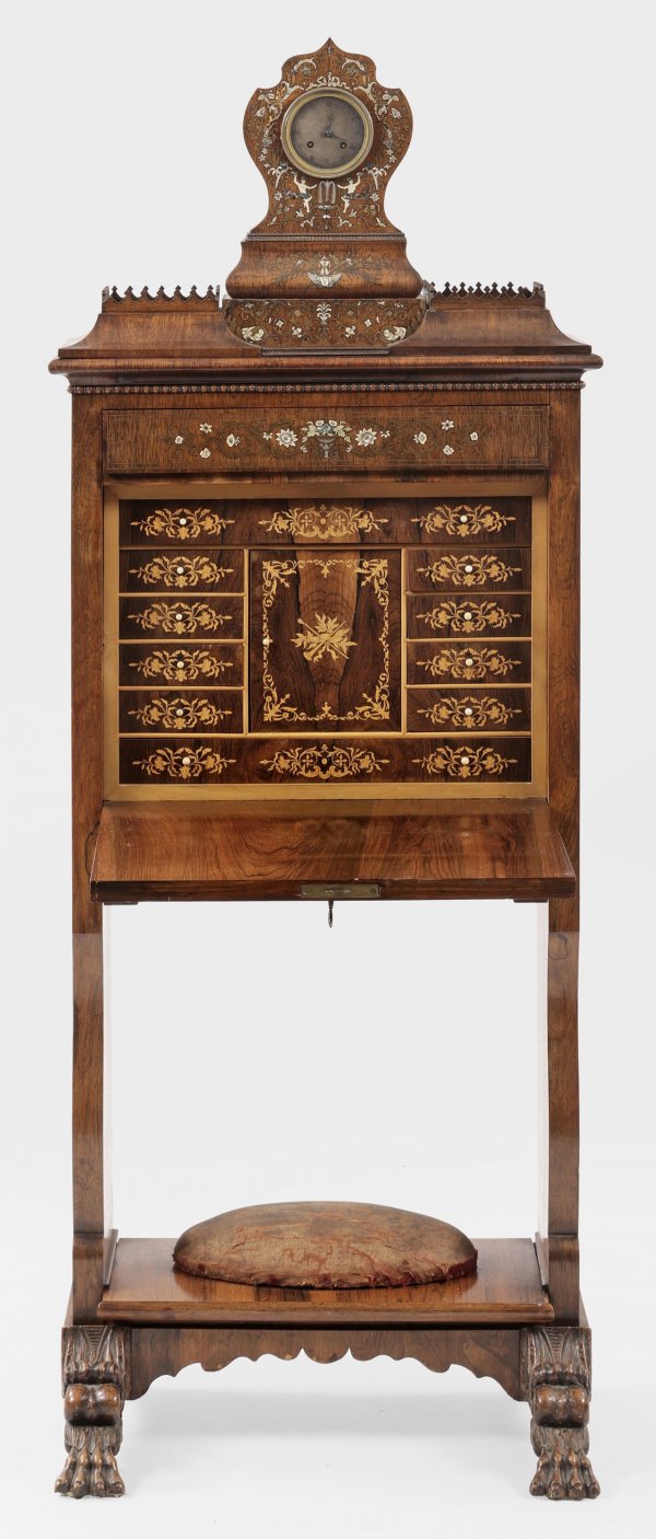 Kleiner Spätbiedermeier-Sekretär Palisander und Ahorn furniert sowie Einlagen aus graviertem Messing, Zinn, Perlmutt und Lack. Balusterförmige Seitenwangen auf vollplastisch gearbeiteten Tatzenfüßen. In der gegliederten Front zwei schmale Schubfächer, teilw. mit Einteilung für Nähutensilien sowie abklappbare Arbeitsfläche. Dahinter gestaffelte Facheinteilung. Podestförmiger oberer Abschluss mit Zinnen sowie balusterförmiger Abschluss mit Uhreneinsatz. Pendulenwerk mit Fadenaufhängung sowie Halbstundenschlag auf Glocke. Schauseitig reiche Marketerie aus Füllhörnern, Blüten und schmalen Fadeneinlagen. H. 162 cm. 62 cm x 40 cm.