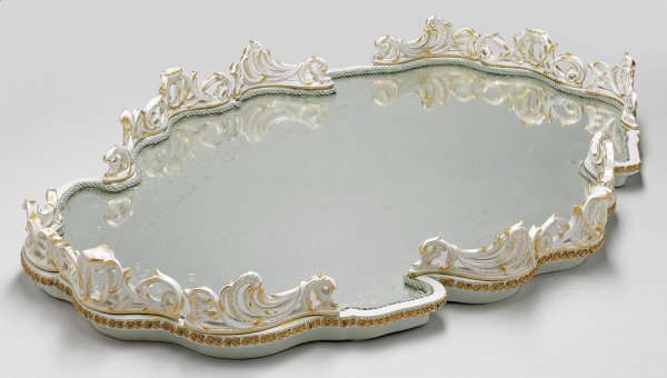 Neorokoko-Tafelaufsatz Passig geschweiftes, profiliertes, hellgrau lackiertes Holztableau mit vergoldeter Akanthusblattbordüre und textilem Kordelband sowie Spiegelglas. Umlaufende Galerierahmung aus einzeln aufgelegten, durchbrochen gearbeiteten, reliefplastischen Rocailleelementen in Porzellan, goldstaffiert. Zepter- und Malereimarke. 73 cm x 49 cm.