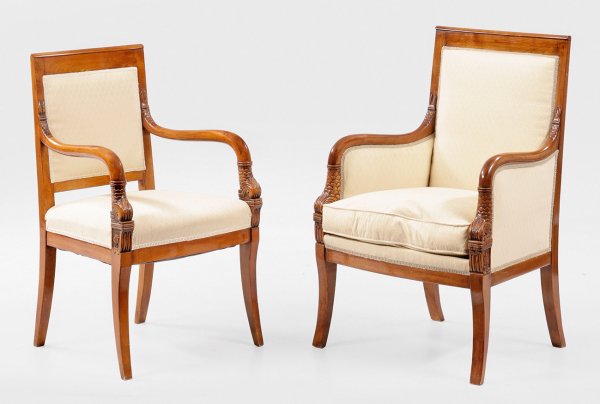 Kirschbaum, massiv und furniert. Trapezförmige Zarge auf leicht ausgestellten Vierkantbeinen. Reliefplastisch gestaltete Delfine als Stützen für geschweifte Armlehnen. Rechteckige, leicht gewölbte Rückenlehnenrahmung. Gepolstert und bezogen. Sitz-H. 46 cm.