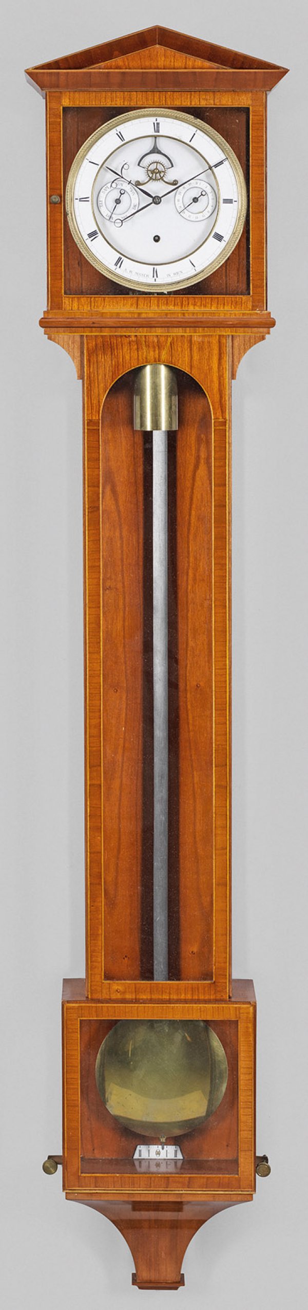 Große Wanduhr sog. "Laterndluhr" bzw. "Dacheluhr". Kirschbaum, furniert. Schlanker, hochrechteckiger, dreiseitig verglaster Uhrenkasten aus schmalen Streben. Vorkragender Uhrenkopf mit flachem Dachabschluss sowie korrespondierender unterer Abschluss. Profilgerahmtes Zifferblatt mit Datums- und Wochentagsanzeige. Bez. A.W. Mayer in Wien. Mechanisches Werk mit Langpendel. H. 144 cm.